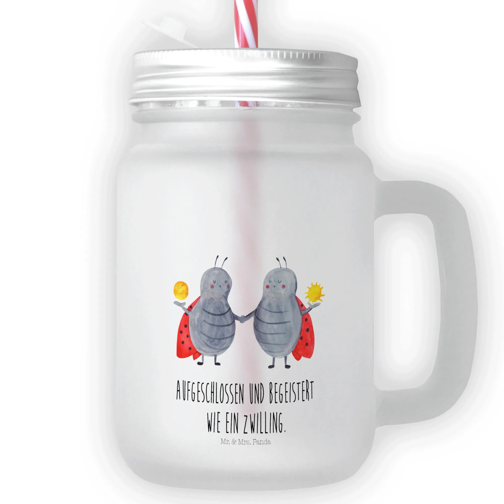 Das ganz besondere Trinkglas Mason Jar mit dem niedlichen Motiv 'Sternzeichen Zwilling' von Mr. & Mrs. Panda ist das perfekte Geschenk für alle, die die Zwillingsenergie in ihrem Leben feiern möchten! Ein likable und designbewusstes Glas, das gleich mehrere Vorteile vereint: Mit seinem silbernen Metalldeckel und dem stabilen Trinkhalm ist es ideal für erfrischende Sommerdrinks, Limonade oder auch für einen tollen Cocktailabend. Das hochwertige, satiniertes dickwandige Premiumglas sorgt für einen edlen Look und eine angenehme Haptik, während die matte Oberfläche das Motiv perfekt zur Geltung bringt.