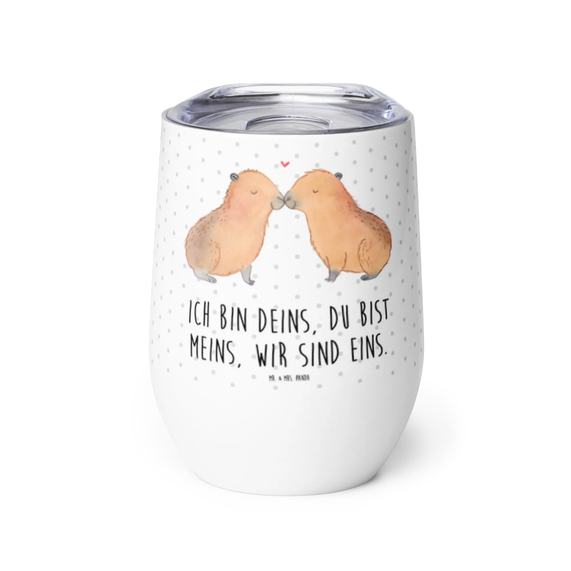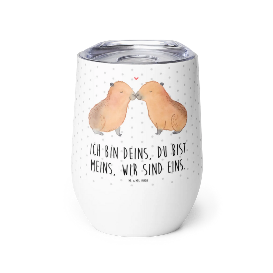 Dieses charmante Motiv von Mr. & Mrs. Panda zeigt zwei Capybaras, die sich sanft an der Nase berühren und dabei ein Herz formen. Über ihnen schwebt ein kleines rotes Herz, das die leidenschaftliche Verbindung der beiden Tiere betont. Die Capybaras sind handgezeichnet und strahlen in warmen Brauntönen, die eine friedliche und glückliche Atmosphäre schaffen. Der liebenswerte Spruch 'Ich bin deins, du bist meins, wir sind eins.' macht dieses Motiv zu einem perfekten Ausdruck reiner Tierliebe und einer wunderschönen Geschenkidee für besondere Anlässe wie Jahrestage, Hochzeitstage oder einfach als kleiner Liebesbeweis. Es ist eine wunderbare Erinnerung daran, wie wertvoll die Liebe in unserem Leben ist.