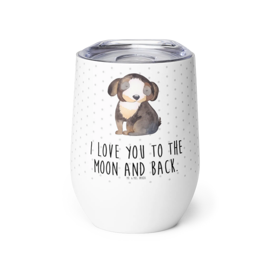 Suchst du ein Geschenk, das zugleich praktisch und emotional ist? Unser Weinbecher mit dem Motiv „Hund entspannt" verbindet charmantes Design mit cleverer Funktion. Der liebevoll gezeichnete schwarz-weiße Hund strahlt Ruhe aus und der kleine Spruch „I love you to the moon and back.“ macht jedes Glas zu einem persönlichen Liebesbeweis.