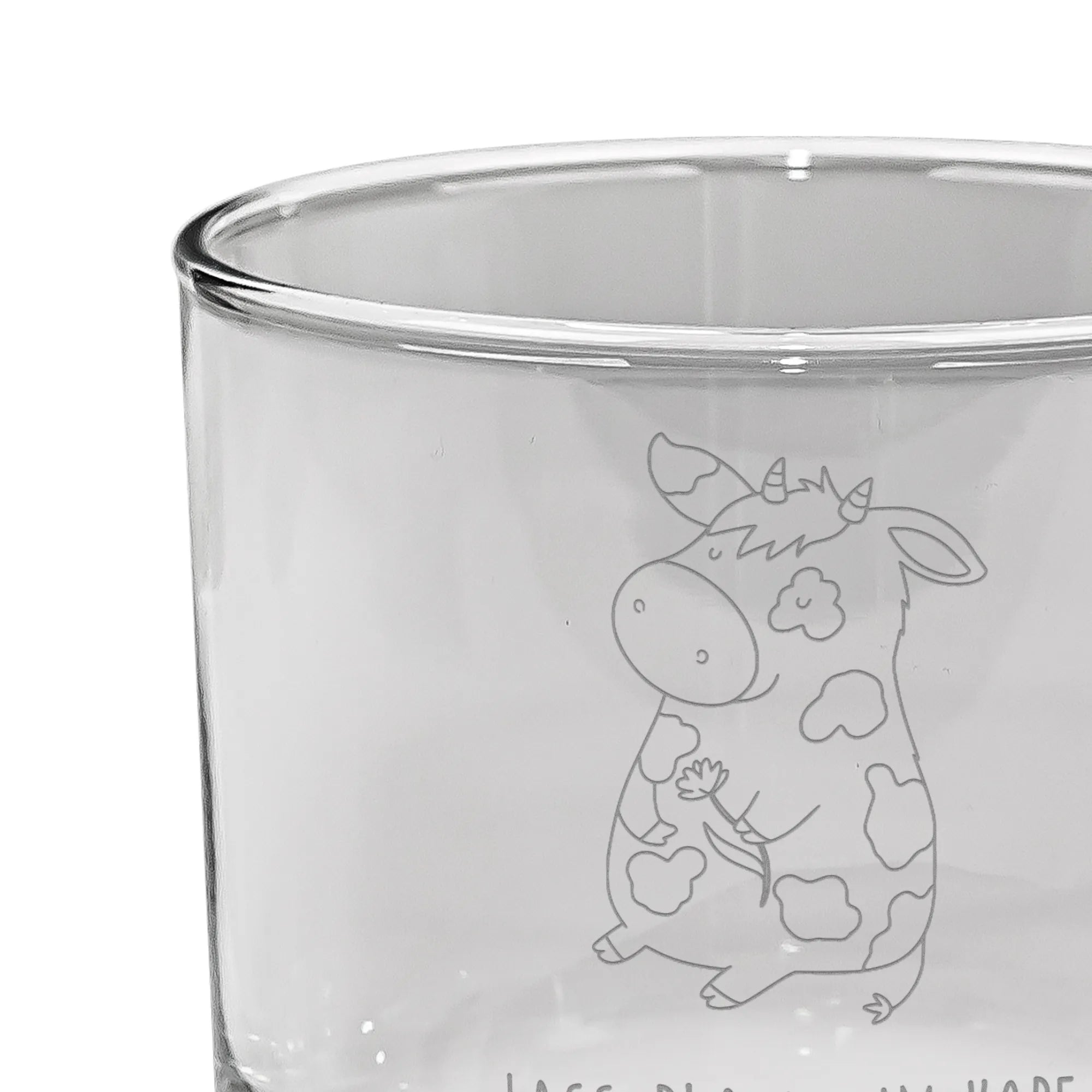 Gefertigt aus robustem Premium-Glas, hat das Glas eine Füllmenge von 300 ml und eignet sich hervorragend, um deinen Lieblingswhiskey stilvoll zu genießen. Die hochwertige Lasergravur sorgt für einen matten Effekt und bringt die charmante Kuh, die stolz eine Blume in der Hand hält, besonders zur Geltung.