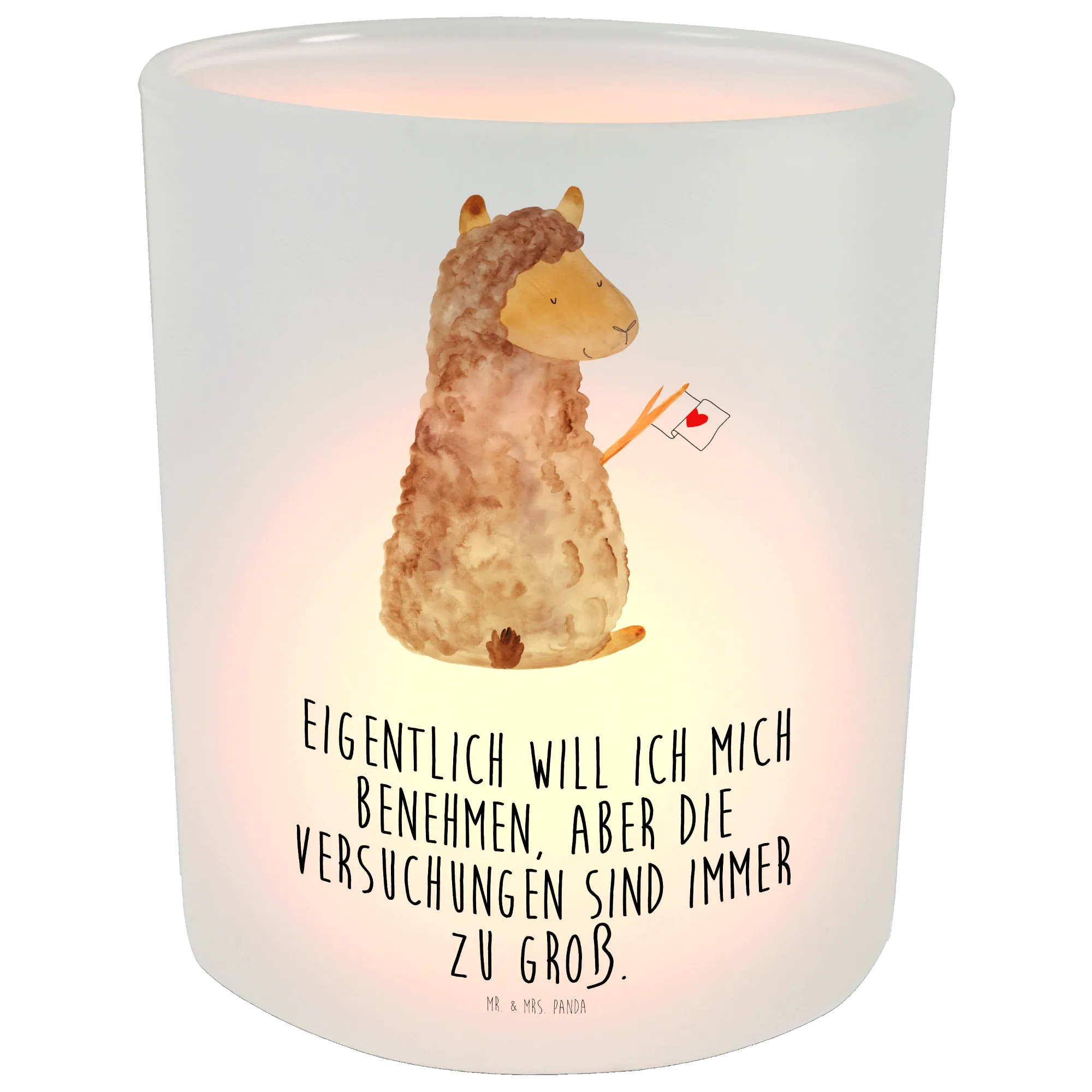 Dieses liebevoll gestaltete Windlicht Glas mit dem fröhlichen Alpaka-Motiv zaubert sofort gute Laune in Dein Zuhause. Das süße Alpaka hält eine Fahne mit Herz und begleitet Dich mit dem kleinen, frechen Spruch: „Eigentlich will ich mich benehmen, aber die Versuchungen sind immer zu groß.“ Genau das Richtige, wenn Du nach einer charmanten Windlicht Dekoration suchst, die sowohl modern als auch romantisch wirkt. 🌟