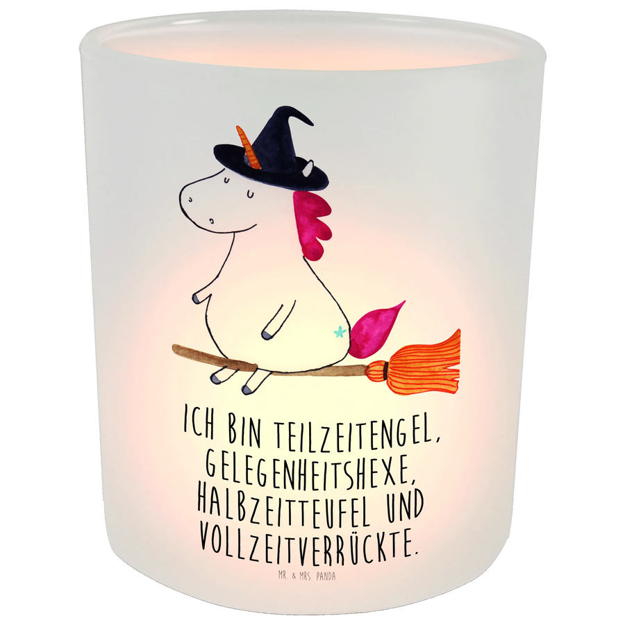 Die süße Darstellung eines Einhorns, das auf einem Besen reitet und einen Hexenhut trägt, spricht vor allem Frauen an, die das Leben mit einem Schuss Magie und Kreativität leben. Ist deine beste Freundin oder Ehefrau eine "Teilzeitengel, Gelegenheitshexe, Halbzeitteufel und Vollzeitverrückte"? Dann wird sie sich über dieses bezaubernde Windlicht ganz besonders freuen! Es eignet sich nicht nur als Deko-Element für ihr Zuhause, sondern auch als originelles Hochzeitsgeschenk oder zur Feier eines besonderen Anlasses.