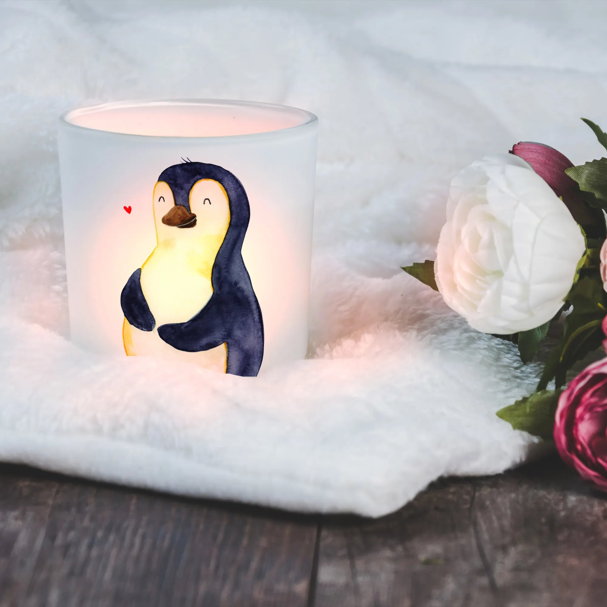 Das schöne Windlicht mit dem fröhlichen Pinguin-Motiv aus der Pinguin-Kollektion von Mr. & Mrs. Panda ist das perfekte Geschenk für alle, die ein wenig Humor in ihre Diät-Situation bringen wollen. Ob für Dich selbst oder als liebevolle Überraschung für Freunde und Familie - dieses Teelichtglas ist eine zauberhafte Möglichkeit, eine gemütliche Atmosphäre zu schaffen.