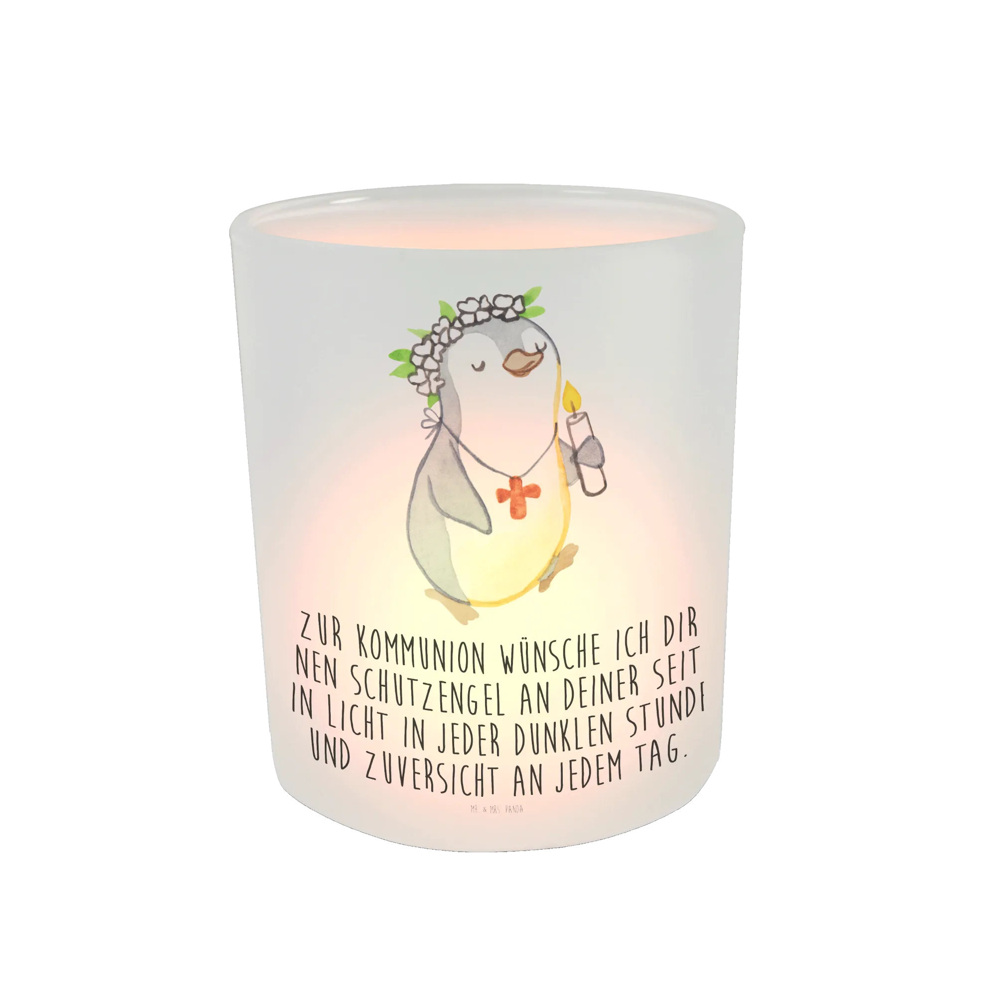 Das Windlicht Pinguin Kommunion Mädchen von Mr. & Mrs. Panda ist das perfekte Geschenk zur Kommunion, Konfirmation oder Jugendweihe! Dieses liebevoll gestaltete Windlicht aus satiniertem Glas sorgt für eine gemütliche und romantische Atmosphäre und ist ein ganz wunderbares Deko-Element für jeden festlichen Anlass.