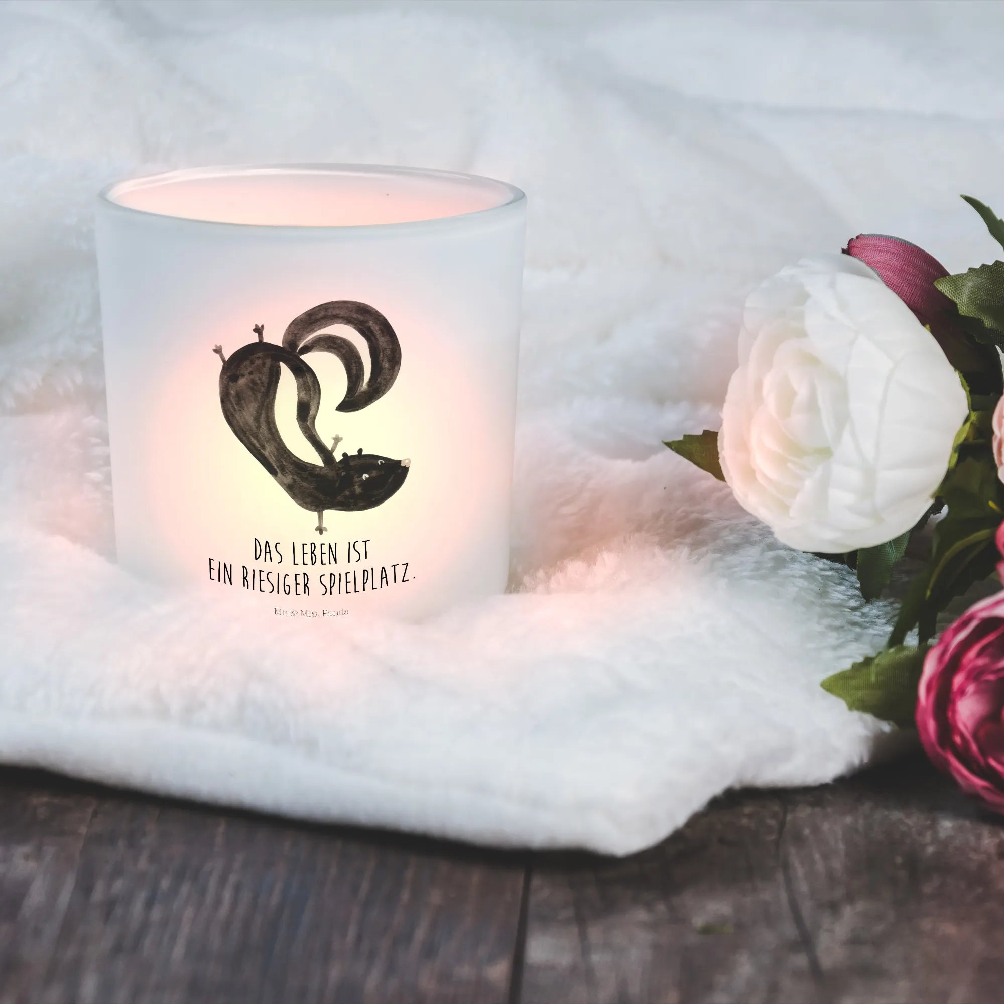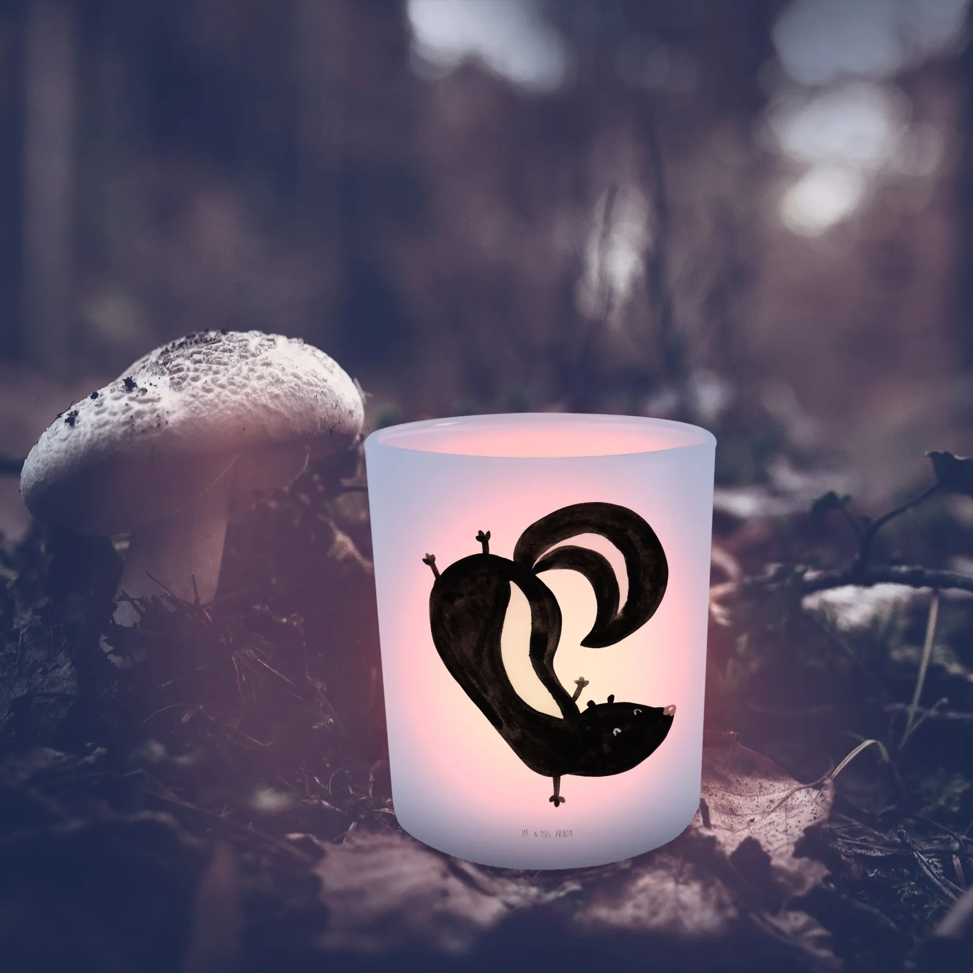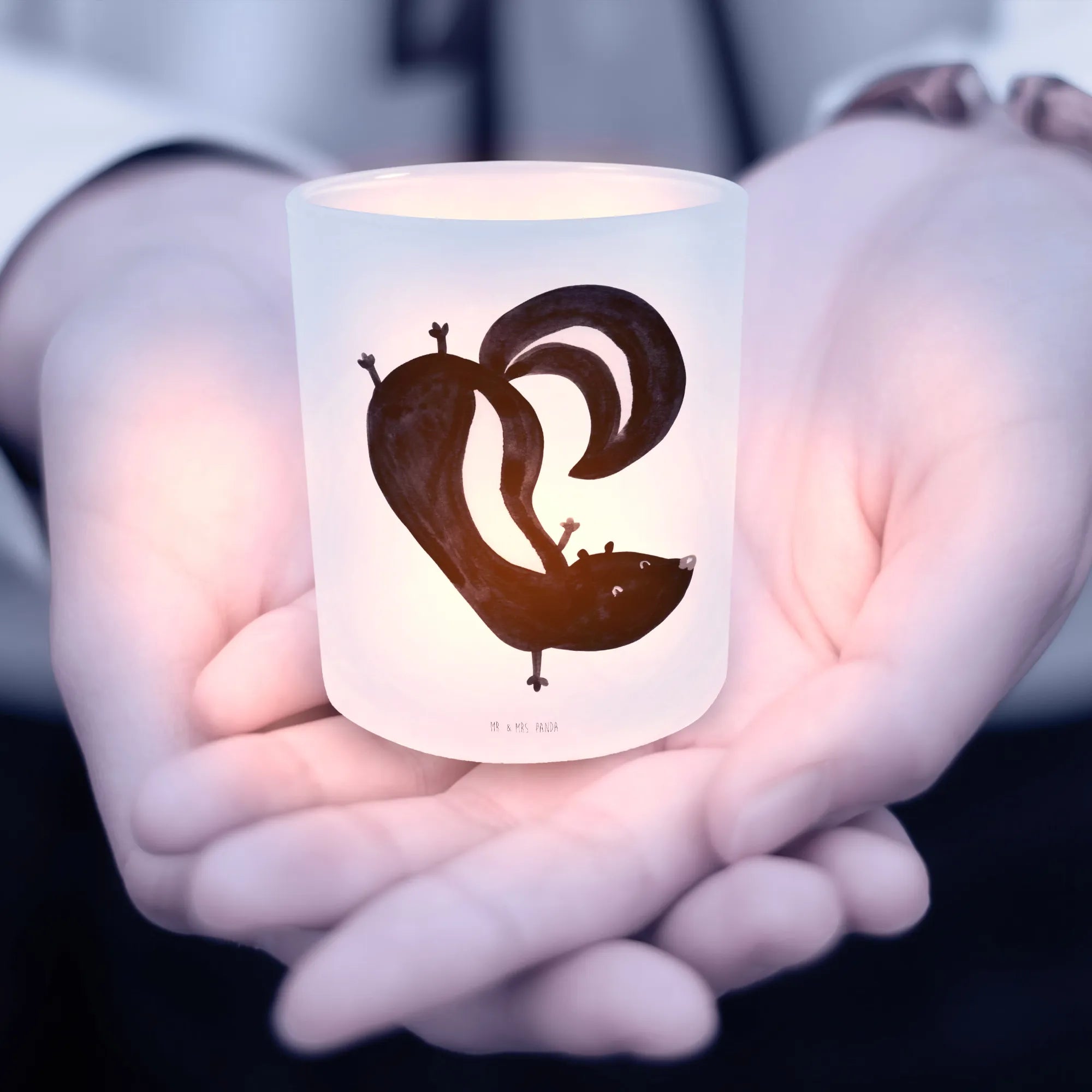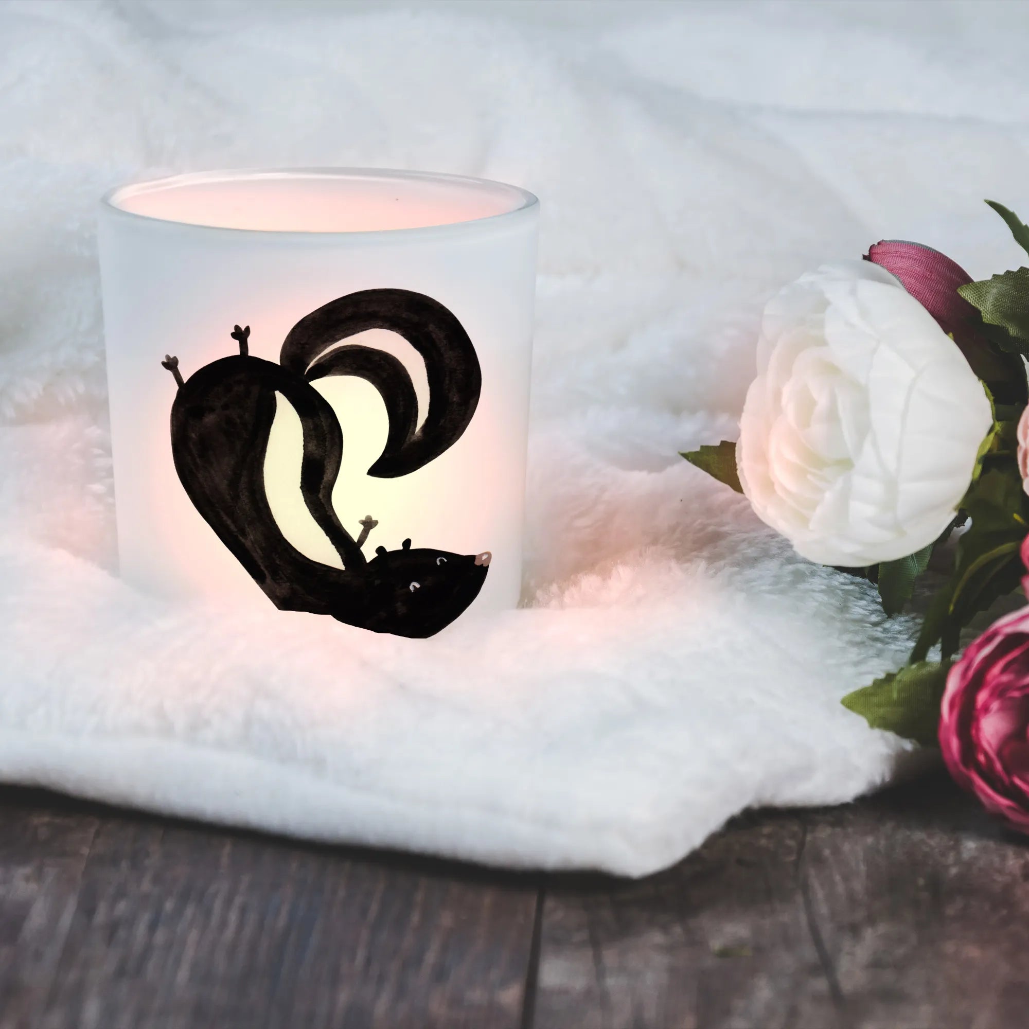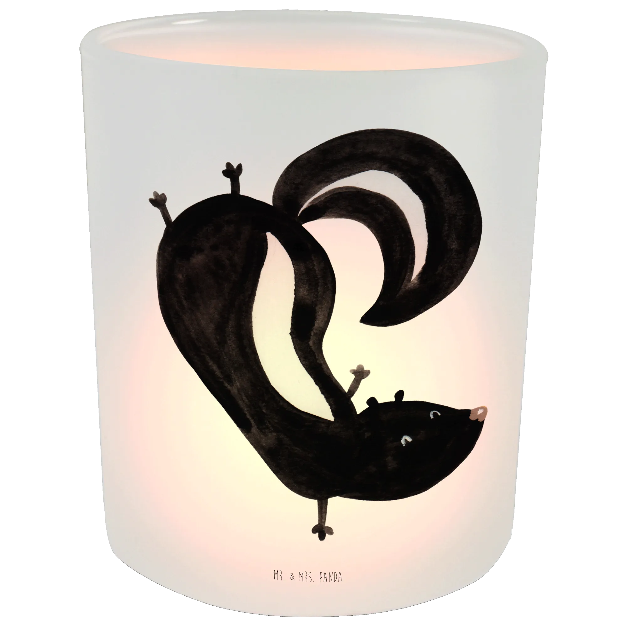Ein wunderschönes edles Windlicht von Mr. & Mrs. Panda, das mit dem zauberhaften Motiv eines Stinktiers im Handstand verziert ist. Dieses Windlicht ist mehr als nur ein dekorativer Artikel - es bringt eine gemütliche und romantische Stimmung in jeden Raum. Das süße Stinktier, das sportlich einen Handstand macht, wurde liebevoll in Aquarell gemalt und verleiht Deinem Zuhause einen Hauch von Lebensfreude.