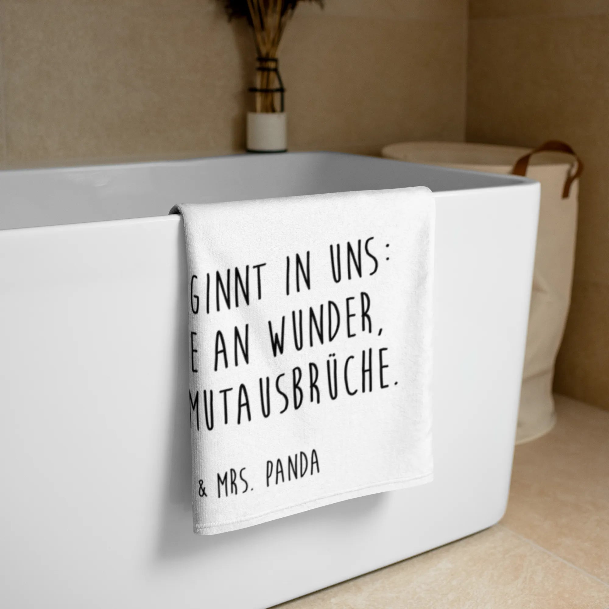 Einzeln oder im Set mit anderen Produkten der Kollektion, wie z.B. den niedlichen Tiermotiven und Sprüchen, verzaubert das XL Badehandtuch mit seinem unverwechselbaren Charme und bringt Freude in jeden Haushalt. Abgerundet wird dieses tolle Handtuch durch den inspirierenden Slogan „Das beginnt in uns: Glaube an Wunder, Liebe, Mutausbrüche“, den Du überall hin mitnehmen kannst.