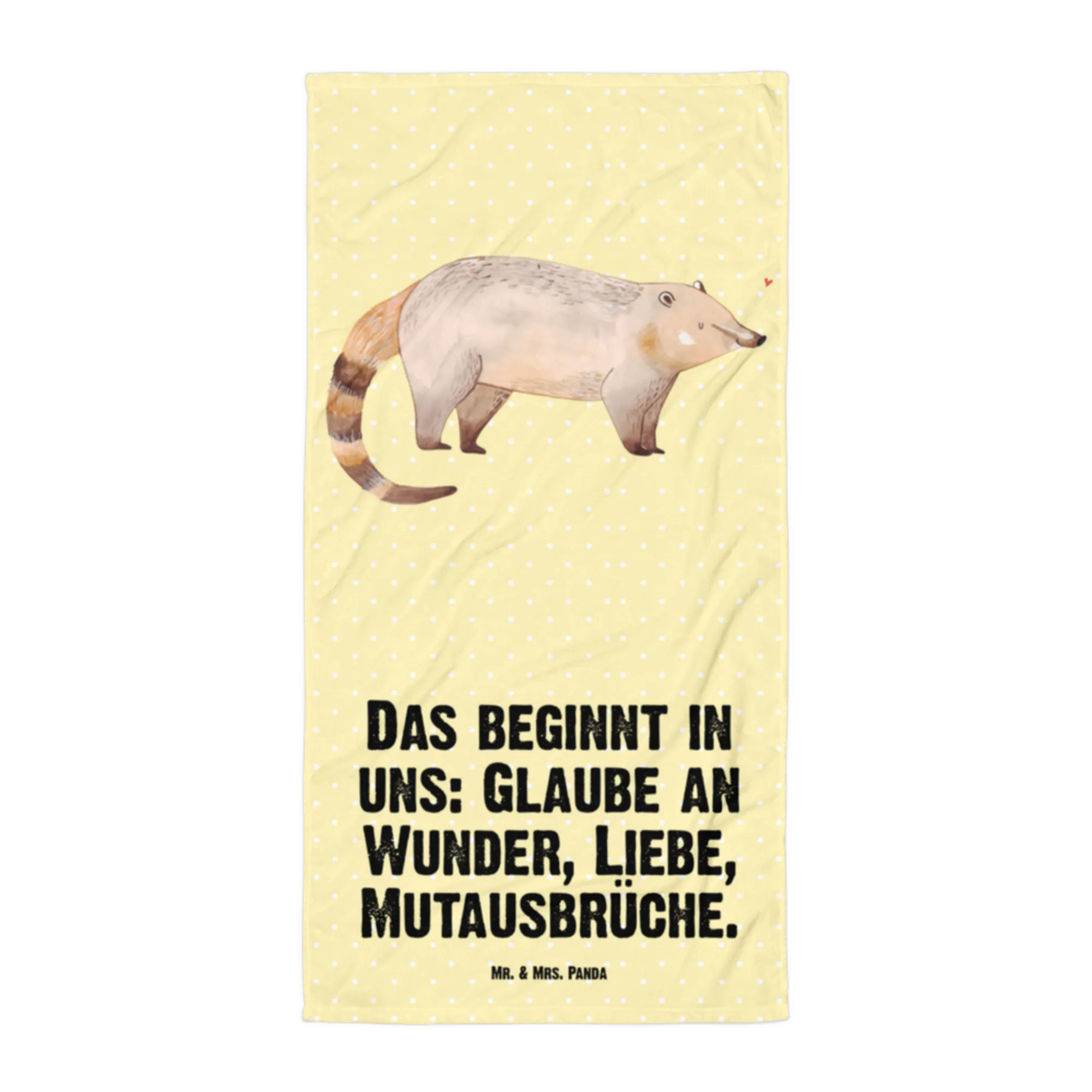 Dieses Motiv von einem Nasenbären, auch liebevoll Rüsselbär genannt, wird Ihrem Tag einen Hauch von Zauber verleihen. Mit seinem verspielten Blick und dem sanft geschwungenen Schwanz offenbart er eine Welt voller Wärme und Fantasie. Mr. & Mrs. Panda haben mit 'Das beginnt in uns: Glaube an Wunder, Liebe, Mutausbrüche' einen Spruch geschaffen, der wie eine sanfte Umarmung für die Seele wirkt. Dieser kleine Nasenbär erinnert uns daran, das Leben mit einer Prise Optimismus und einem Herz voller Liebe zu betrachten. Lassen Sie sich von ihm inspirieren, jeden Tag als eine Chance zu begreifen, Ihr eigenes Wunder zu gestalten.