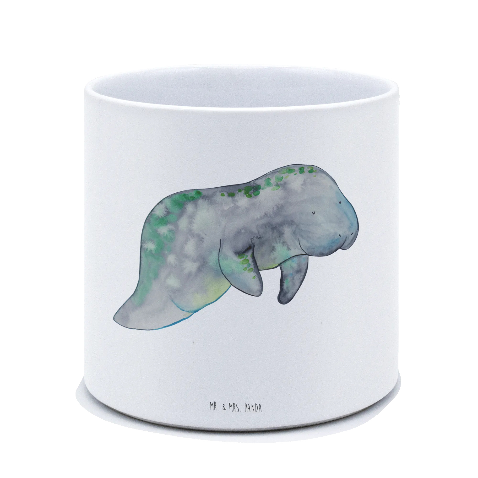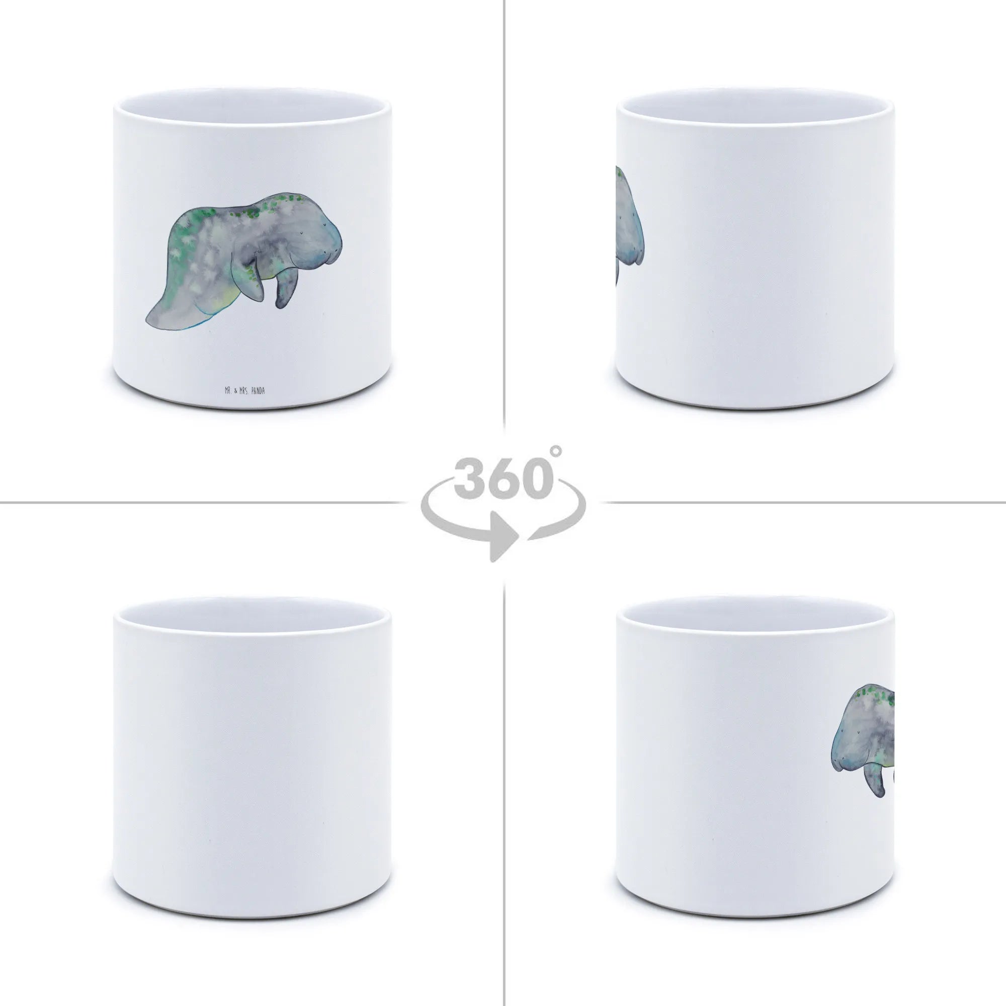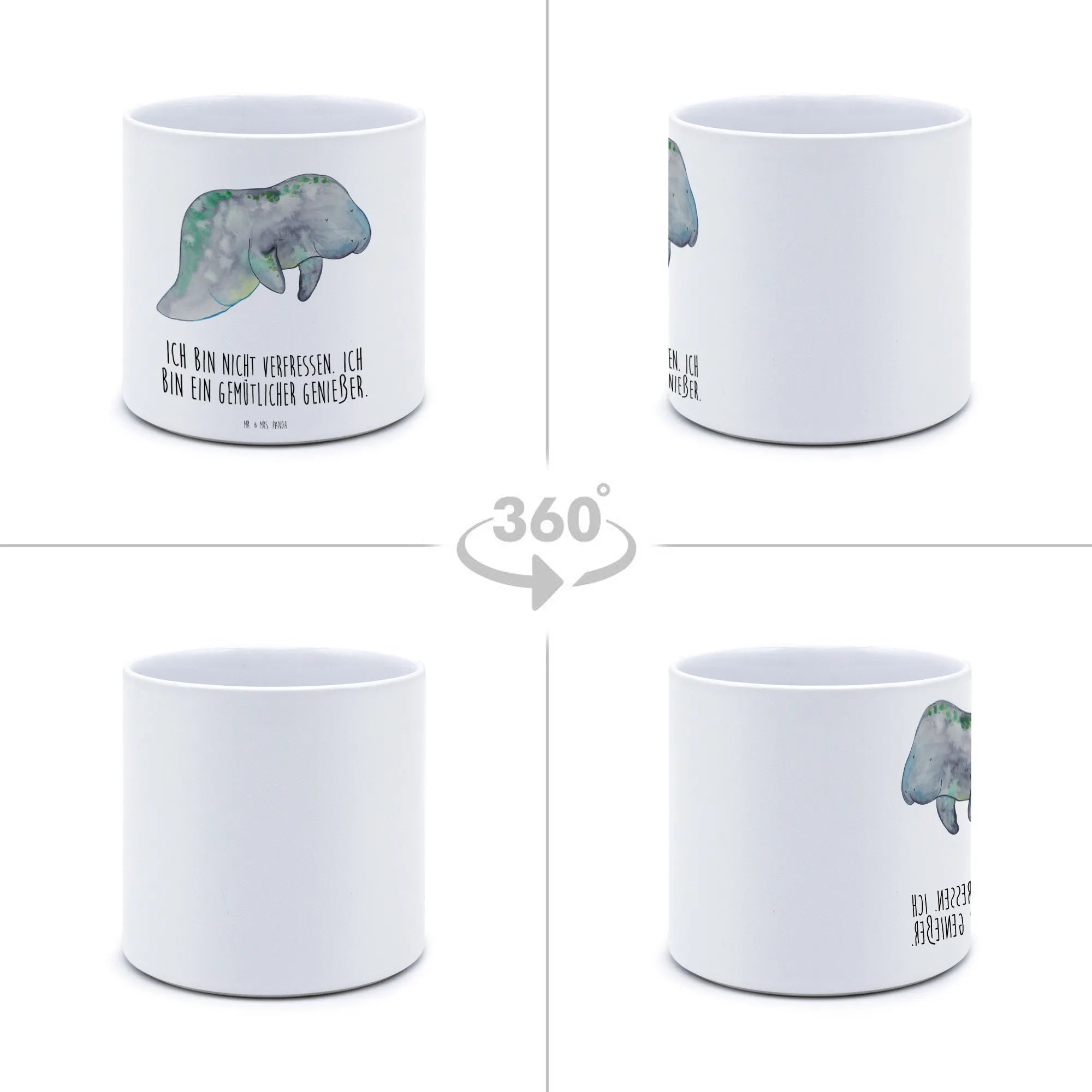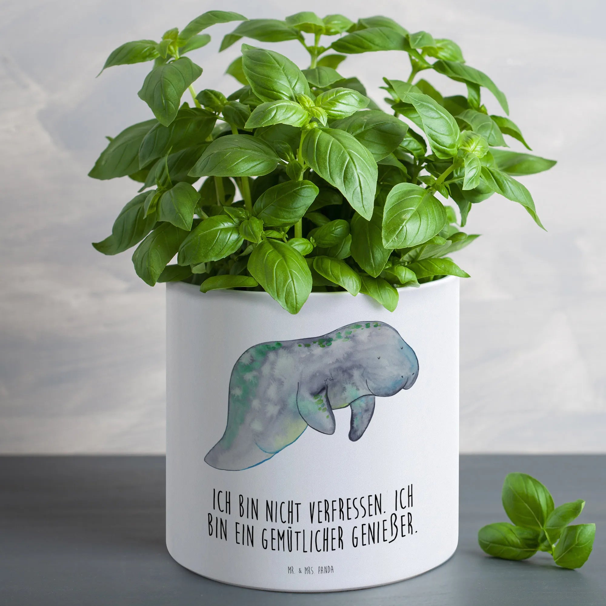 Der XL Blumentopf "Seekuh chillt" von Mr. & Mrs. Panda ist das perfekte Geschenk für alle, die eine Vorliebe für die Meereswelt haben. Mit einer bezaubernden Illustration einer entspannten Seekuh, die in sanften Aquarellfarben gestaltet ist, bringt dieser Blumentopf eine gemütliche Urlaubsatmosphäre in jedes Zuhause.