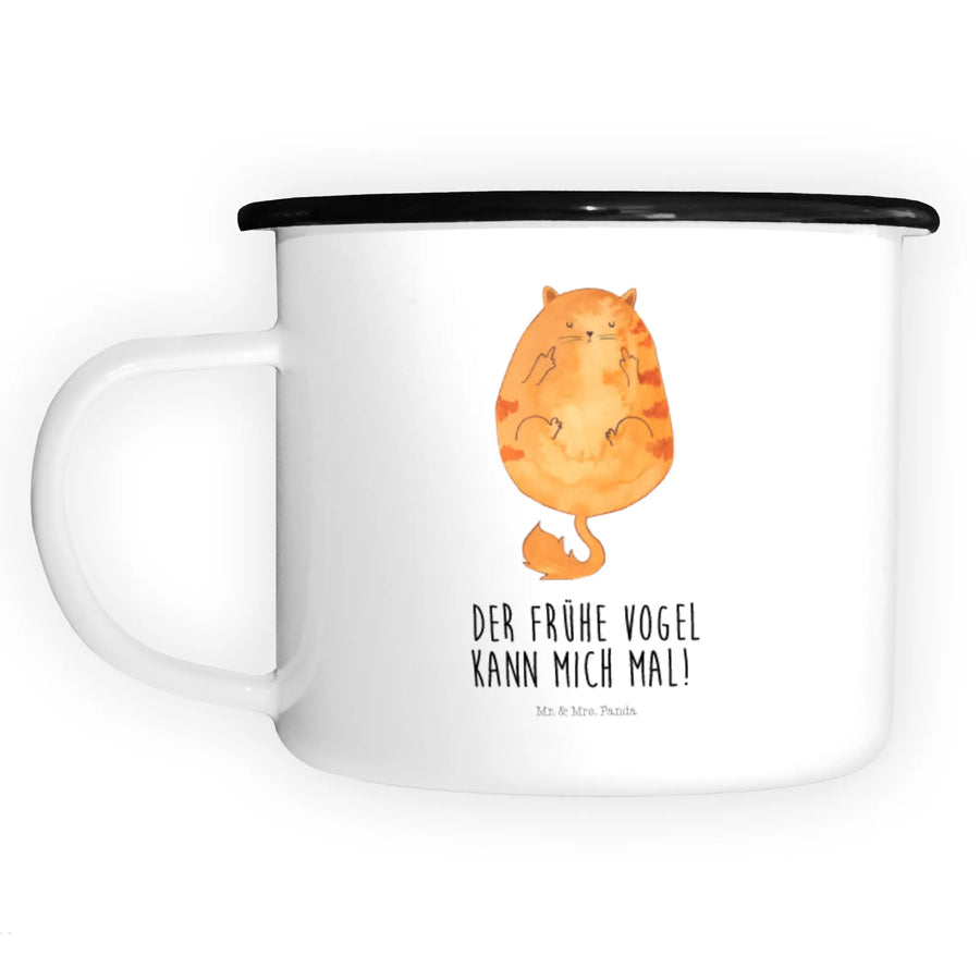 Die XL Emaille Tasse Katze Frühaufsteher von Mr. & Mrs. Panda ist der perfekte Begleiter für alle Katzenliebhaber und Kaffeegenießer! Mit ihrem charmanten Design und dem witzigen Slogan 'Der frühe Vogel kann mich mal!' zaubert sie jedem ein Lächeln ins Gesicht.